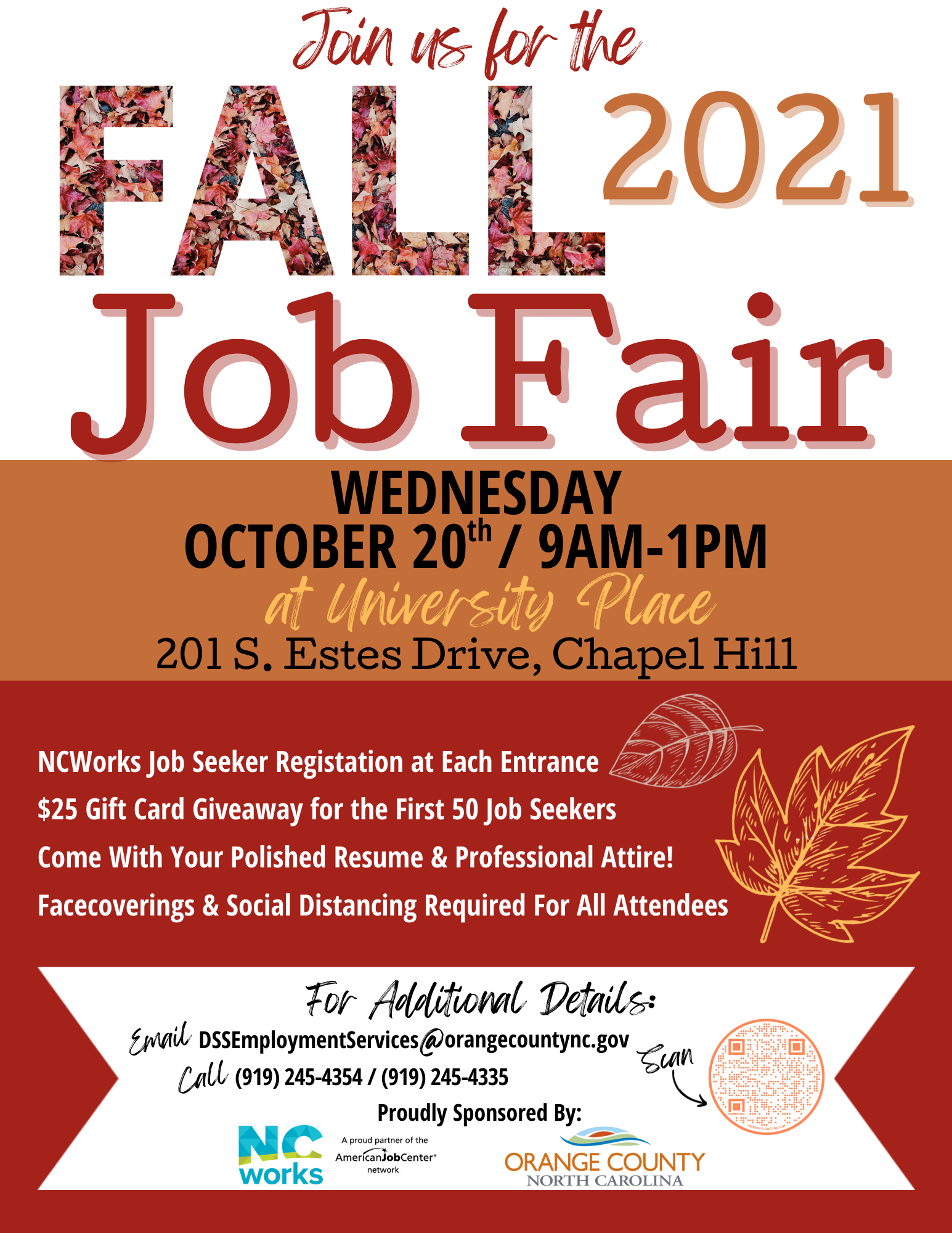 The NCWorks Career Center of Orange County/Orange County DSS Employment Services will be hosting a job fair at University Place on Wednesday, October 20th from 9 a.m. - 1 p.m. Job seekers will be able to register on-site. The first 50 to arrive will receive a $25 gift card.