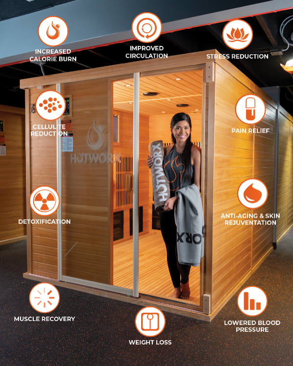 HOTWORX is a virtually instructed exercise program created for users to experience the many benefits of infrared heat absorption, while completing a 30-minute isometric workout or a 15-minute High Intensity Interval (HIIT) session. As the infrared heat penetrates your body causing you to sweat, the isometric postures further accelerate detoxification by physically removing the toxins from your organs through muscle contraction.