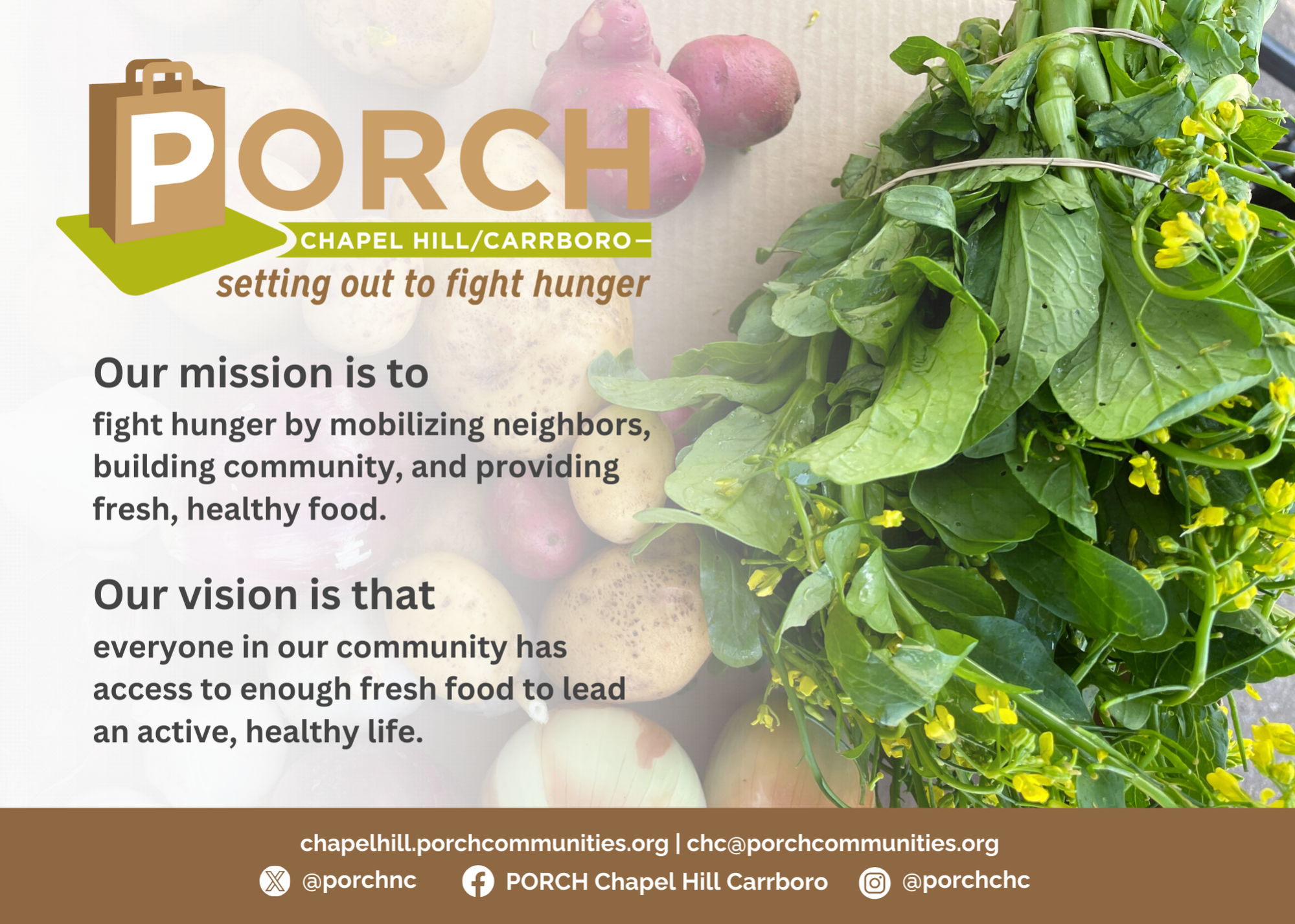 PORCH Chapel Hill-Carrboro is a non-profit hunger relief organization that fights hunger by mobilizing neighbors, building community, and providing fresh, healthy food. Through our direct grocery distribution, school snacks program, pantry support program, and advocacy, we work towards a future where everyone in our community has access to enough fresh food to lead an active, healthy life. Since our founding in 2010, PORCH Chapel Hill-Carrboro has contributed more than $6.5 in direct hunger relief to the Chapel Hill and Carrboro community.