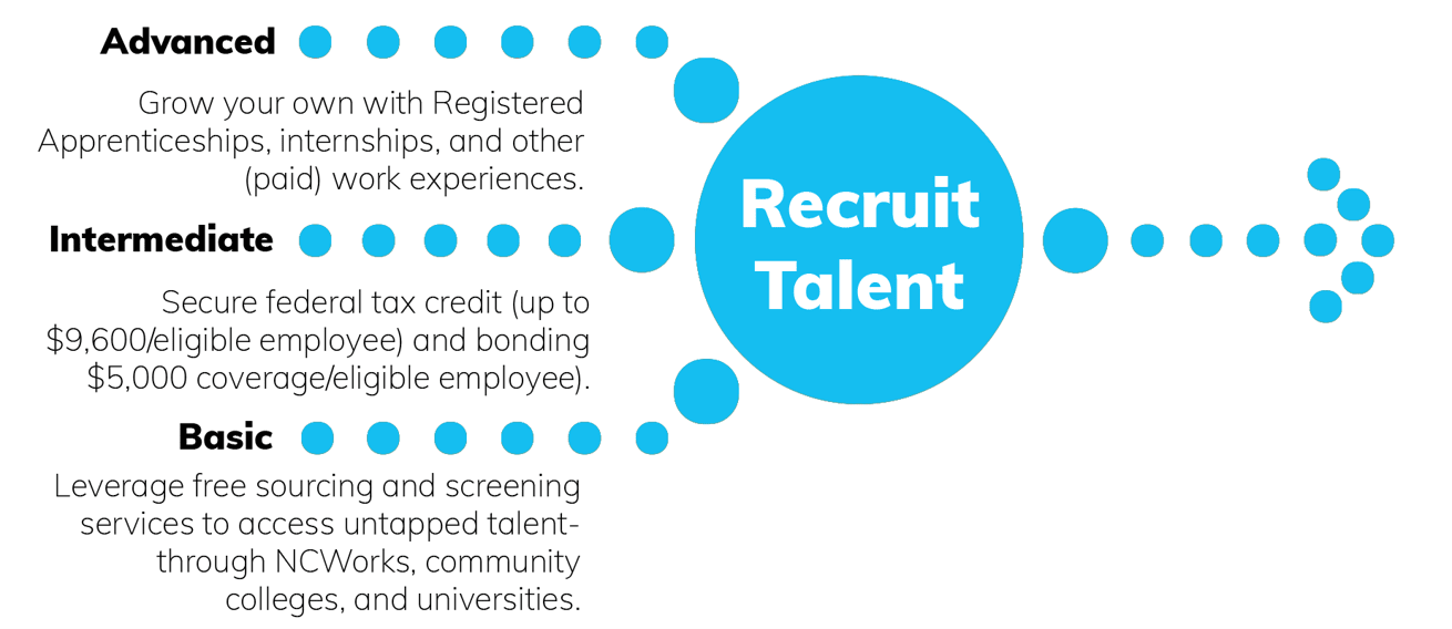 Those employers who are really hitting a dead end with finding job applicants should consider often overlooked talent pools, including veterans, youth, older workers, people with disabilities, people who speak English as a second language, people who are housing or food insecure, those currently unemployed, and job seekers with criminal records. This step takes an employer to the intermediate level, as there are federal incentives for employers who hire candidates from untapped talent pools, including up to $9,600 per eligible employee through the Workforce Investment Opportunity Act (WIOA) Tax Credit, and a free, $5,000 fidelity bond for every “at risk” individual hired, which helps protect the employer from acts of dishonesty. The workforce development boards (there are 23 regional boards across the state) have staff ready to help local employers access these funds. For questions and to learn more, set up an appointment with Glenda Morrow, who is the business services representative for the Regional Partnership Workforce Development Board, which serves Orange, Alamance, Montgomery, Moore, and Randolph Counties. You can reach Glenda at (336) 570-6800 or gmorrow@regionalcs.org.